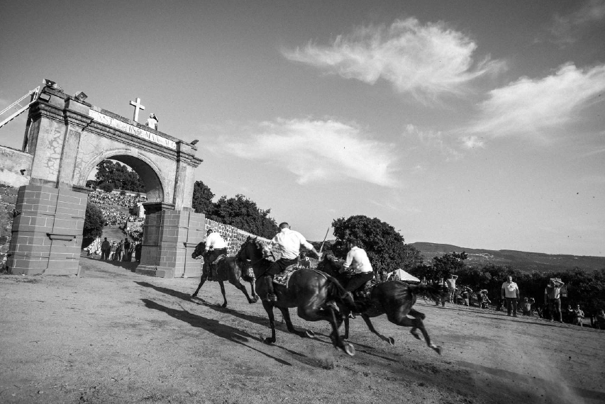 Reportage bianco e nero che documenta l'Ardia, una festa tradizionale di fede e devozione che si svolge a Sedilo, in Sardegna. L'Ardia è una tradizione annuale che si svolge a Sedilo, caratterizzata da una corsa di cavalieri che si svolge in un contesto di forte devozione e ritualità